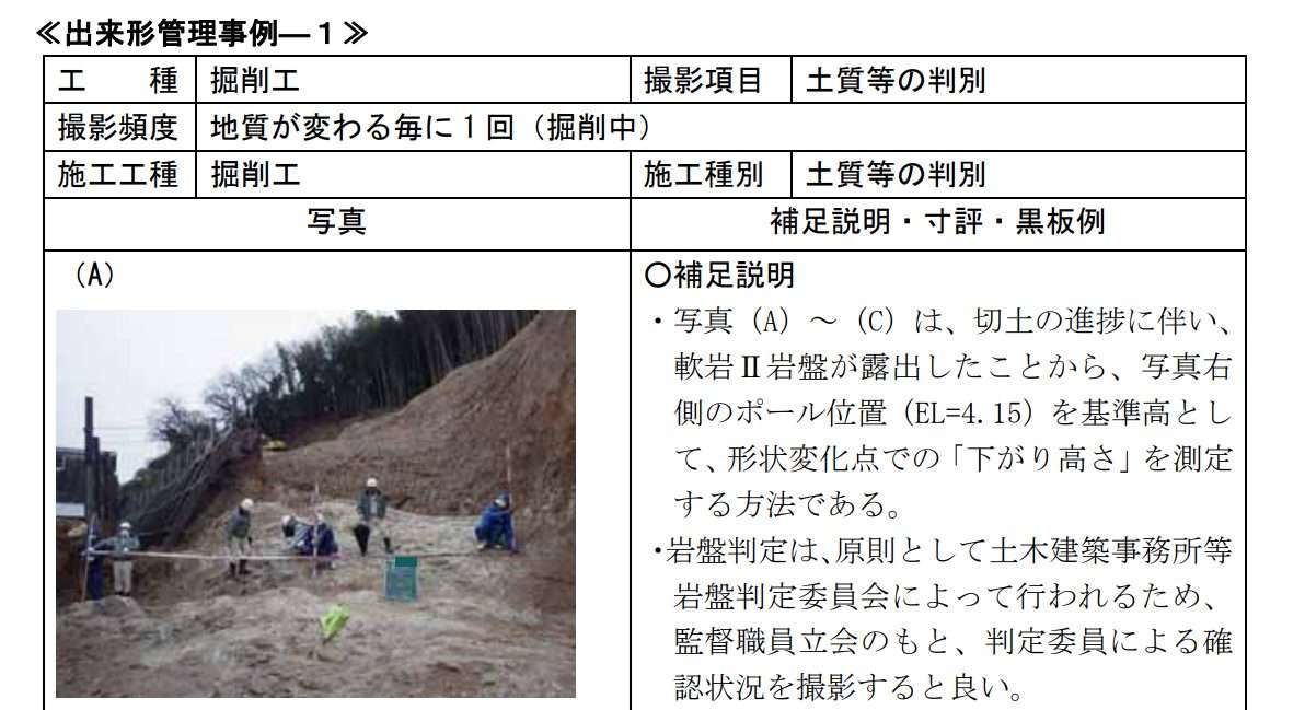 特に岩盤が露出した場合は、基準高を示すポールや丁張を明確に写し込み、判定委員や監督員立会いの様子も記録すると信頼性が高まります。全体写真・近接写真・黒板拡大の3枚を揃えると不備防止に有効です。