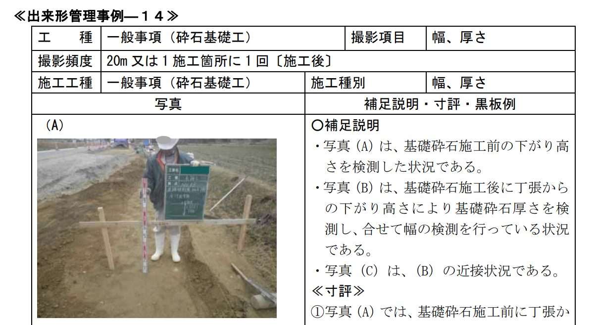 舗装工や路盤工では、各層の厚さを正確に確認できる写真が求められます。