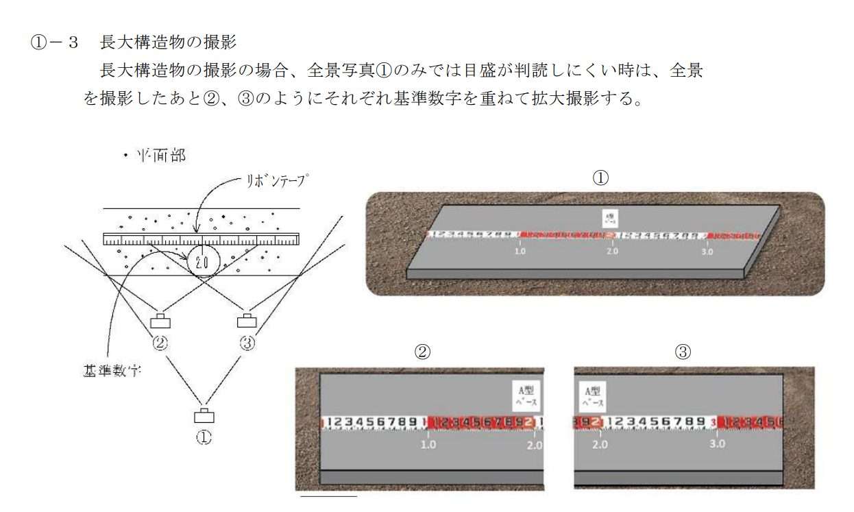 長大な構造物では全景だけでは目盛が判読できないため、全景撮影に加えて基準数字を表示し拡大撮影を組み合わせます。黒板には工種・寸法・測点を明記し、近接撮影で数値が明確に読めるようにすると信頼性が高まります。