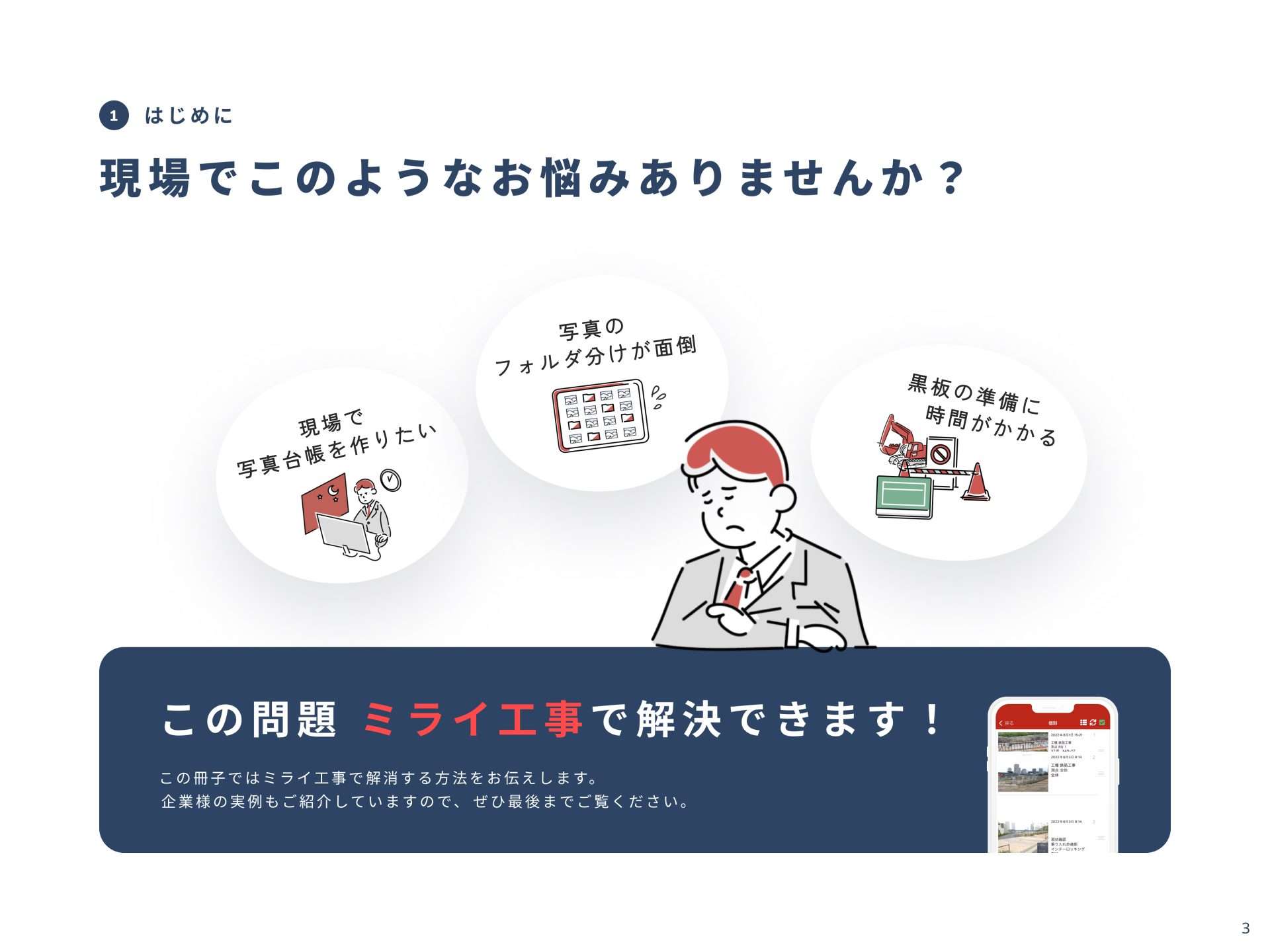 ミライ工事の機能や導入企業様の事例を記載した資料をすぐに閲覧できます。必要事項をご記入の上、ダウンロードしてください。