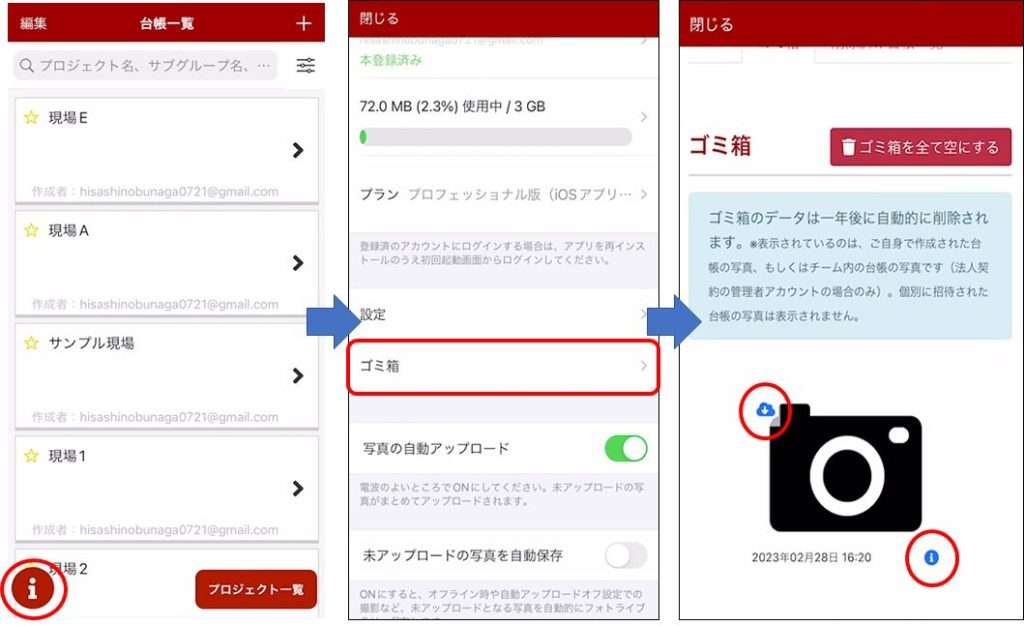 台帳や写真を削除した場合、ゴミ箱に移動されます。 【ゴミ箱の特徴】 ・ゴミ箱内の写真や台帳は復元することができます。 ・ゴミ箱内では台帳単位での削除や写真の一括ダウンロード(WEB版のみ)が可能です。 ・ゴミ箱から削除された写真は復元できません。アプリ、WEBどちらでも利用可能です。 ・削除した写真はゴミ箱に移動してから1年間経過すると自動的に削除されます。 ・ゴミ箱内の写真データは容量としてカウントされます。