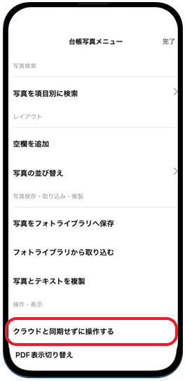 事前に、現場で使用したい台帳を作成し、電波状況のよいところで、台帳をダウンロードする必要があります。 使用する台帳を開き、写真一覧右上のメニューより「台帳データをアプリに保存する」をタップし、保存します。 この操作で、端末へ台帳がダウンロードされます。 次に、インフォメーション・設定画面にて、操作設定→クラウド同期の順にタップしクラウド同期をOFFにします。 すると、台帳一覧の表示が、事前にダウンロードした台帳のみになり、「クラウド同期OFF」と表示されます。 台帳を開くと、「コピーされた台帳」と表示され、端末にダウンロードされた台帳と分かるようになっています。 写真をタップすると、通常の写真編集画面となりますので、差し替え撮影及び編集を行っていただけます。 ※差し替え撮影した写真は、「未アップロード」状態となります。必ず電波状況のよいところで「クラウド同期」をONにして、アップロードを完了してください。 現場に行く都度台帳をアプリに保存する手間を省きたい場合、台帳設定画面にて「台帳データをアプリに保存する」をONにしていただく事で、最新の台帳データがアプリに保存されます。 ※こちらの機能は常に通信が発生しますので、パケットのデータ容量がかかります。