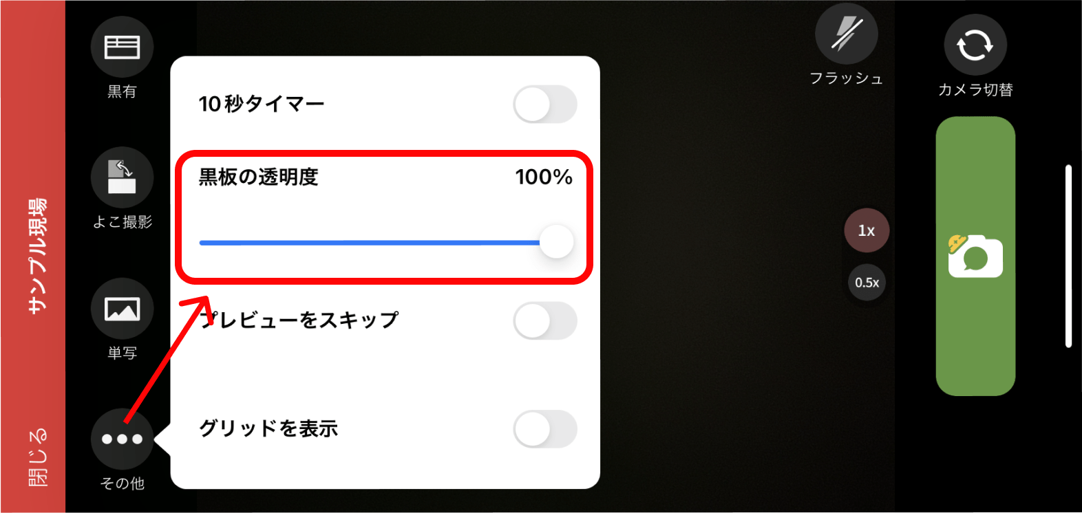 撮影画面で、黒板の透明度を調整することができます。