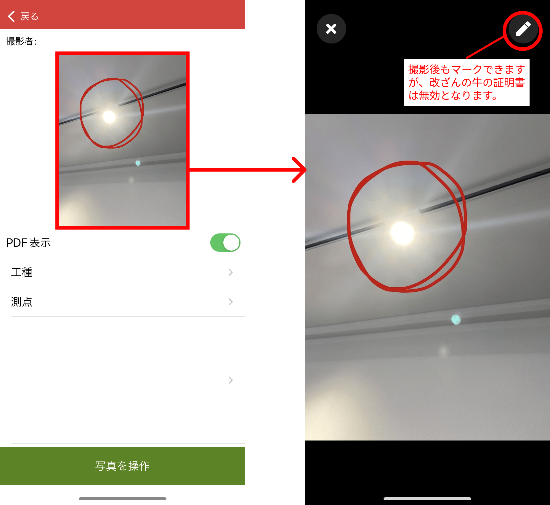 写真撮影後のプレビュー画面で、画面右上に表示されるペンマークをタップすると「マーキングモード」に切り替わり、マーキングや文字を入力することが可能です。 マーキングモード時、同時に表示される矢印マークでひとつ前の操作に戻り、ゴミ箱マークでマーキングを消すことができます。 また保存した写真へのマーキングも可能です。 ※保存した写真をマーキングすると、J-COMSIAの改ざんチェック証明書は外れます。