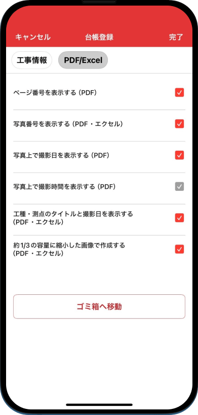 設定画面より設定可能です。 アプリから操作する場合は、台帳設定から「写真番号を表示する(PDF・エクセル)」のチェックを外して「完了」ボタンをタップします。 WEB版からも設定からPDFの項目で設定することができます。