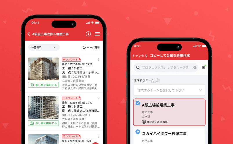 手順としては台帳のテンプレートを作成して、台帳新規作成時にコピーできます。 台帳の文章が電子黒板に反映され、現場では写真の差し替え撮影だけで済みます。
