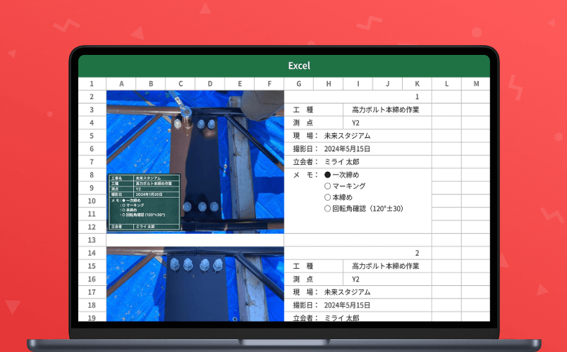 これにより、写真台帳を作成するうえで担当者にかかるストレスを大きく削減します。 特に撮影から台帳作成まで2名以上が携わる運用で大きな効果を発揮します。